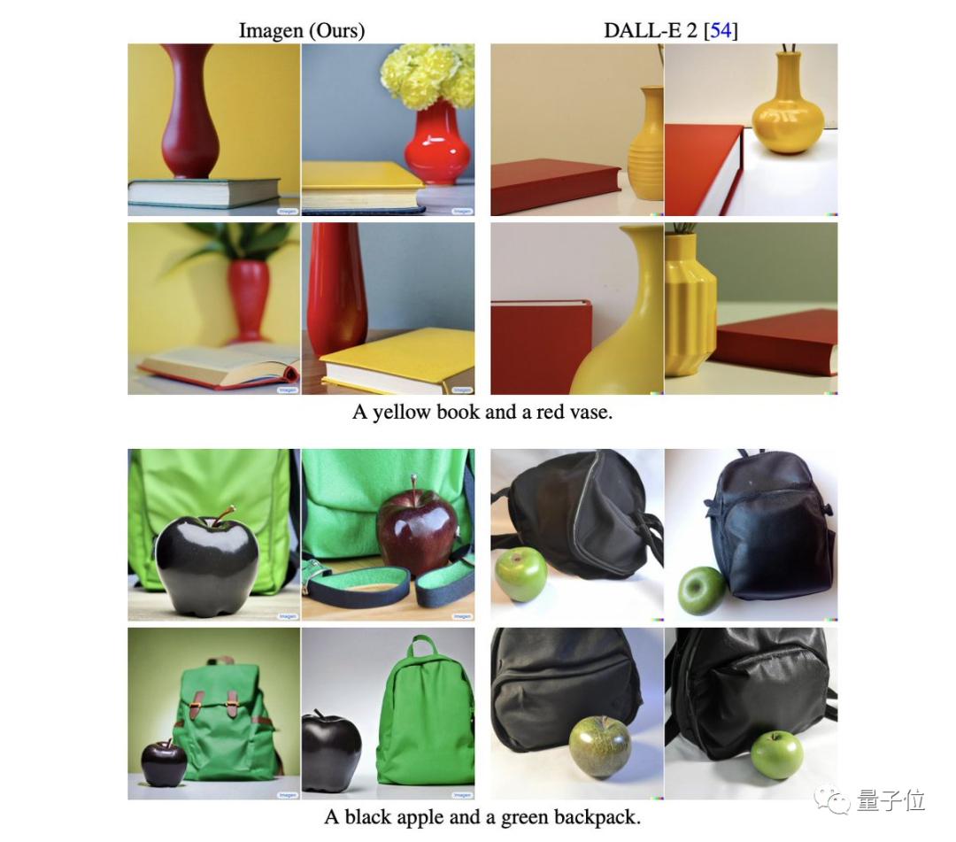 实验发现,DALL·E 2难以准确理解同时出现两个颜色要求的情况,而Imagen就没问题。