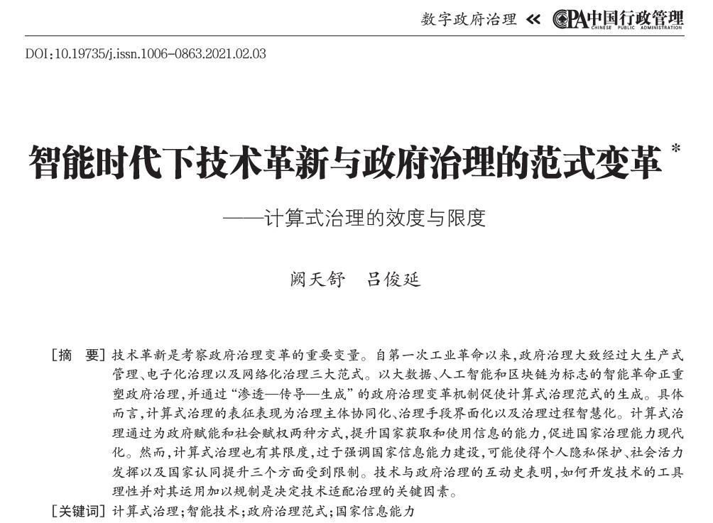 原标题:《顶刊论文 | 智能时代下技术革新与政府治理的范式变革—计算式治理的效度与限度》