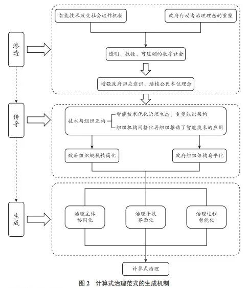 技术发展对政府治理范式的变革依循一种特定过程机制,即“渗透—传导—生成”。首先,技术是被政府组织中的人执行和应用的。因此,技术革新不会直接催生政府治理范式的变革,而是受组织理性、政治约束以及社会结构等技术执行因素的影响。其中,组织中的人对技术的感知、理解与应用至关重要。倘若缺乏组织文化等软性要素的支撑,再智能的技术都无法达致理想的治理效果。以大数据、人工智能、云计算为代表的智能技术手段,逐渐渗透进政府治理的过程,并促使政府管理者转变治理理念。其次,智能技术作为传导中介,将政府治理理念转化为实践,推动政府治理结构的调整。最后,智能技术为政府治理提供了强大的计算能力,并构建起一个与物质世界相平行的“数字世界”,促使以预测为核心的计算式治理范式的生成。