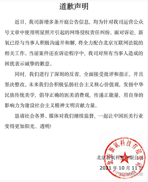 彼时新氧医美平台客服称,系平台部分用户私自在文章中使用明星照片导致平台被起诉,公司的相关部门已介入此事。此后新氧发布道歉声明称,将与当事人积极沟通和解,也将全力配合北京互联网法院的相关工作。