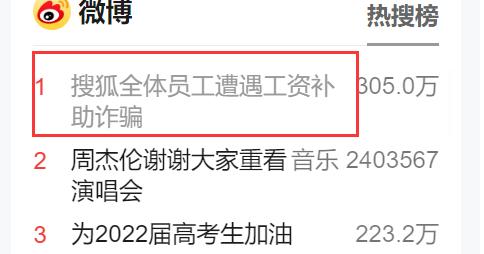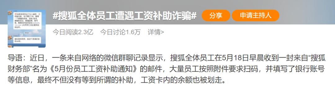 5月25日,“搜狐全体员工遭遇工资补助诈骗”的话题冲上微博热搜,截至目前,话题热度已达2.3亿。