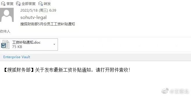 5月24日,一名微博大V发文称,搜狐员工收到一封公司内部域名发来的邮件,主题是工资补贴,很多员工都点击了……最终被骗人数众多,金额巨大。