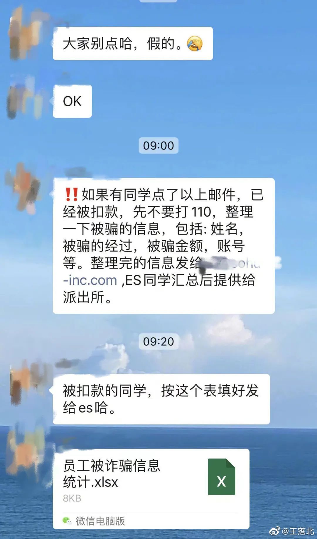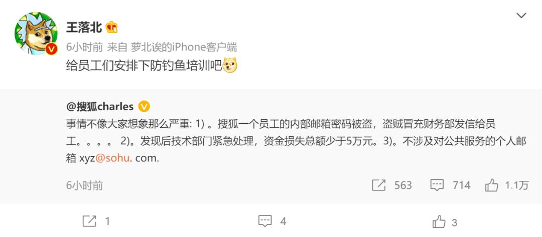 最初发布相关微博的大V“王落北”转发了张朝阳的微博称:给员工安排下防钓鱼培训吧……