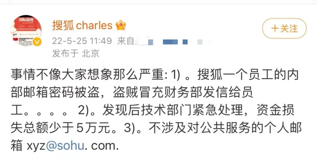 5月25日午间,搜狐CEO张朝阳发微博回应称,事情不像大家想的那么严重。他表示,事件起因是搜狐一个员工的内部邮箱密码被盗,盗贼冒充财务部发信给员工。公司发现后,技术部门紧急处理,资金损失总额少于5万元。另外,此次发送诈骗邮件的不涉及对公共服务的个人邮箱 xyz@sohu. com.