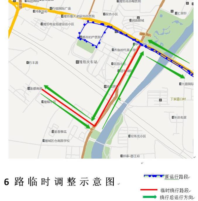 6路下行方向:车辆从东南堤村发车,沿原线路运行至健康街青年路路口后,沿青年路-仓南街至火车站南广场(上行方向反之亦然),在火车站南广场停靠调度发车,不再运行健康街(青年路至向阳路)、和平路(健康街至公交专用通道)、向阳路(健康街至公交专用通道)路段及公交专用通道。