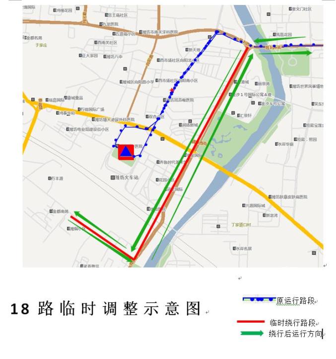 18路下行方向:车辆从三岔河村(竣通机械配套公司)发车,沿原线路运行至胜利街青年路路口后,沿青年路-仓南街至火车站南广场(上行方向反之亦然),在火车站南广场停靠调度发车,不再运行胜利街(青年路至和平路)、和平路(胜利街至公交专用通道)、向阳路(健康街至公交专用通道)、健康街(向阳路至和平路)路段及公交专用通道。