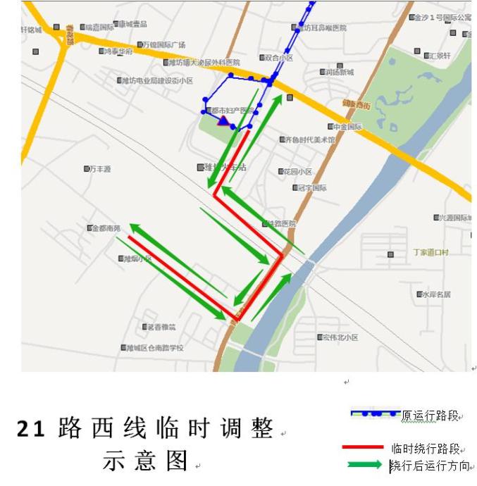 21路(西线)下行方向:车辆从临时终点站官桥发车,沿原线路运行至和平路公交专用通道路口后,沿和平路-东新街-青年路-仓南街至火车站南广场(上行方向反之亦然),在火车站南广场停靠调度发车,不再运行公交专用通道及向阳路(健康街至公交专用通道)、健康街(向阳路至和平路)路段。