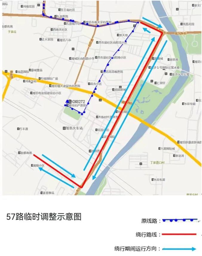 57路下行方向:车辆从前阙庄村发车,沿原线路运行至胜利街和平路路口后,沿胜利街-青年路-仓南街至火车站南广场(上行方向反之亦然),在火车站南广场停靠调度发车,不再运行和平路(胜利街至公交专用通道)、向阳路(健康街至公交专用通道)、健康街(向阳路至和平路)路段及公交专用通道。