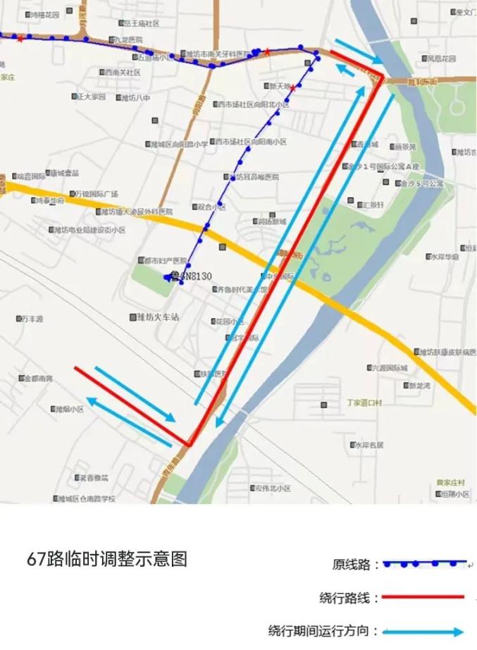 67路下行方向:车辆从前阙庄村发车,沿原线路运行至胜利街和平路路口后,沿胜利街-青年路-仓南街至火车站南广场(上行方向反之亦然),在火车站南广场停靠调度发车,不再运行和平路(胜利街至公交专用通道)、向阳路(健康街至公交专用通道)、健康街(向阳路至和平路)路段及公交专用通道。