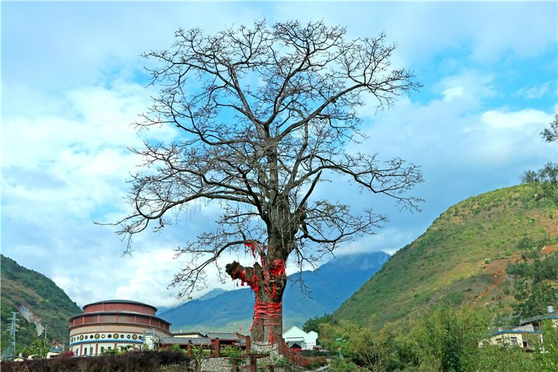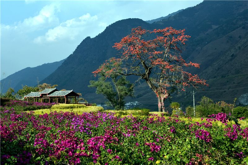 千年古树木棉红,万年福佑有缘人。一棵挺拔磅礴的古树木棉红屹立在百花梯田畔,枝繁叶茂,树干上缠绕着的红色布条,饱含人们对美好生活的向往与期盼。