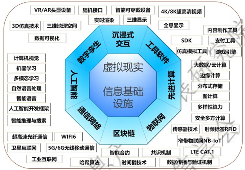以虚拟现实为核心的信息技术构成“元宇宙”技术主干,推动多类型新兴技术融合创新发展。“元宇宙”以虚拟现实(VR/AR/ MR /XR)头显、智能可穿戴、脑机接口等打通与现实世界沉浸式交互的接口,以数字孪生、三维仿真等建模仿真工具、内容制作工具构筑虚实交互体验,以实时渲染、4K/8K 超高清视频、三维/全息显示等实现真实、顺畅的交互呈现,最终在基础芯片、元器件、操作系统等软硬件技术基础上构成“元宇宙”终端入口。