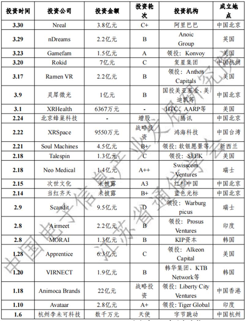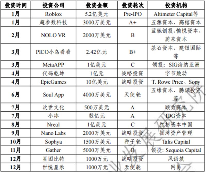 在国内方面,投融资更偏向在 XR、虚拟数字人领域的企业。2021 年 6 月,AR 智能眼镜光学模组供应商耐德佳宣布完成 B1 轮融资;2021 年 7 月,Rokid 官宣完成新一轮投资,规模达数亿元;2021 年 9 月,亮风台宣布完成 2.7 亿元C+轮融资;同月 Nreal 宣布完成 C 轮融资,金额超 1 亿美元。