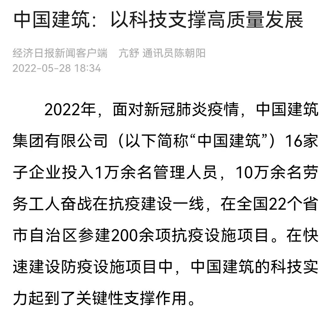 近日,经济日报对中国建筑绿色建造、智慧建造、建筑工业化等以科技支撑企业高质量发展的生动实践进行详细报道。本期“喜迎二十大 建证四十年 奋进新征程”专栏,为您分享《中国建筑:以科技支撑高质量发展》。