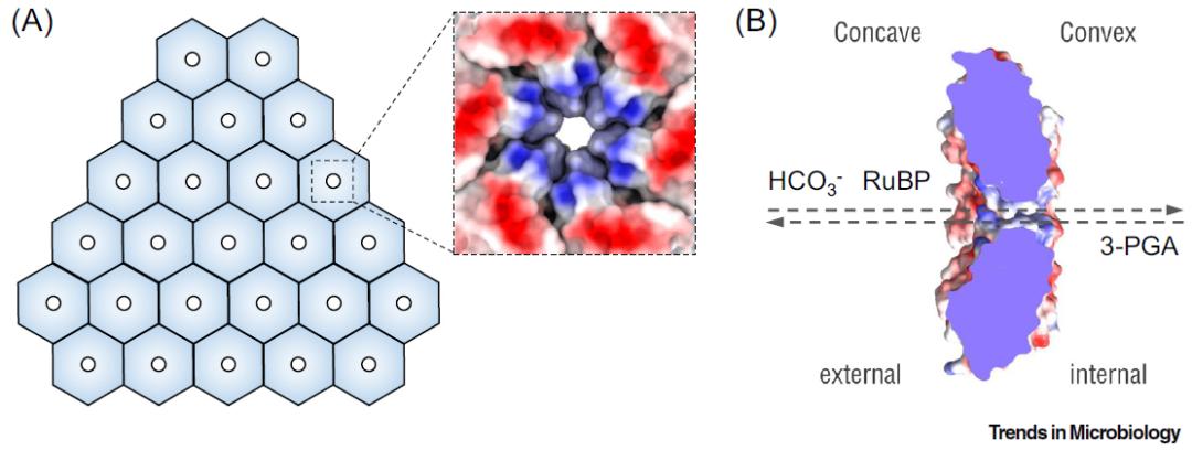 随后,文章对羧酶体蛋白外壳的选择通透机理进行了阐述。当前研究表明,外壳蛋白的中心孔洞带正电荷,可允许带负电荷的碳酸根离子进入羧酶体腔内,同时阻隔无电荷性的二氧化碳和氧气分子通过(图3)。由于外壳蛋白六聚体和五聚体中心孔洞的孔径相对较小,RuBP和3-PGA等大分子代谢底物或产物被认为是通过具有更大孔径的外壳蛋白三聚体进出羧酶体的。另外,羧酶体外壳自身构象的柔性和可塑性也可能有助于对通透性进行调控。外壳蛋白对代谢底物和产物、质子和还原剂的选择通透性,为建立羧酶体腔内特殊的pH和氧化还原态的内环境至关重要。而这一特殊的内环境在Rubisco酶聚集以及调控碳酸酐酶活性和羧酶体功能中是必不可少的。
