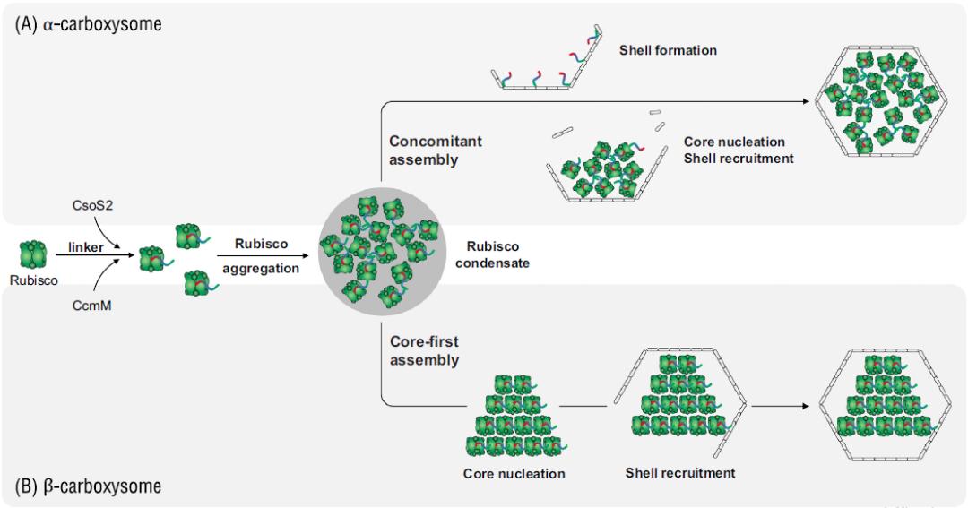 文章进而阐述了两种类型羧酶体中Rubisco酶的组装、激活和聚集形式,以及碳酸酐酶在羧酶体中的功能。Rubisco酶的组装需要一系列分子伴侣蛋白的辅助:在模式蓝细菌聚球藻Synechococcus 7942中,Raf1是必不可缺的重要辅助因子,而RbcX的缺失不会完全破坏Rubisco酶的组装。研究表明Raf1和RbcX都对羧酶体的组装产生影响,其中Raf1尤为重要。根据羧酶体的类型,Rubisco酶的激活需要CbbQO或Rca激酶。Rubisco酶的聚集受具有无序结构的CcmM或CsoS2连接蛋白的多价结合介导,通过液液相分离(liquid-liquid phase separation)形成Rubisco酶的液态聚合体。形成的核心酶聚合体再通过其他特殊的组成蛋白与外壳蛋白结合,最终完成外壳的封装。