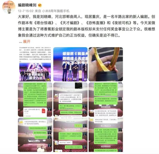 编剧刘晓峰在微博曝光王思聪的香蕉影业拖欠版权费一事