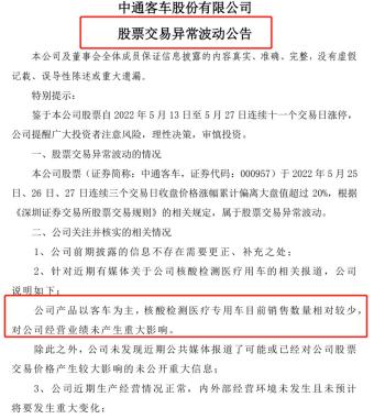 5月29日晚间,在收到深交所关注函并被重点监控后,11连板“核酸检测车”概念股中通客车(000957)终于首次在股价异动公告中官宣:核酸检测医疗专用车目前销量相对较少,对经营业绩未产生重大影响。