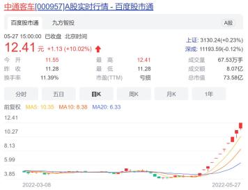 5月13日以来,中通客车开启连续涨停模式,仅用11个交易日便收获了高达186%的涨幅,截至5月27日收盘股价已攀升至12.41元/股,市值达74亿元。