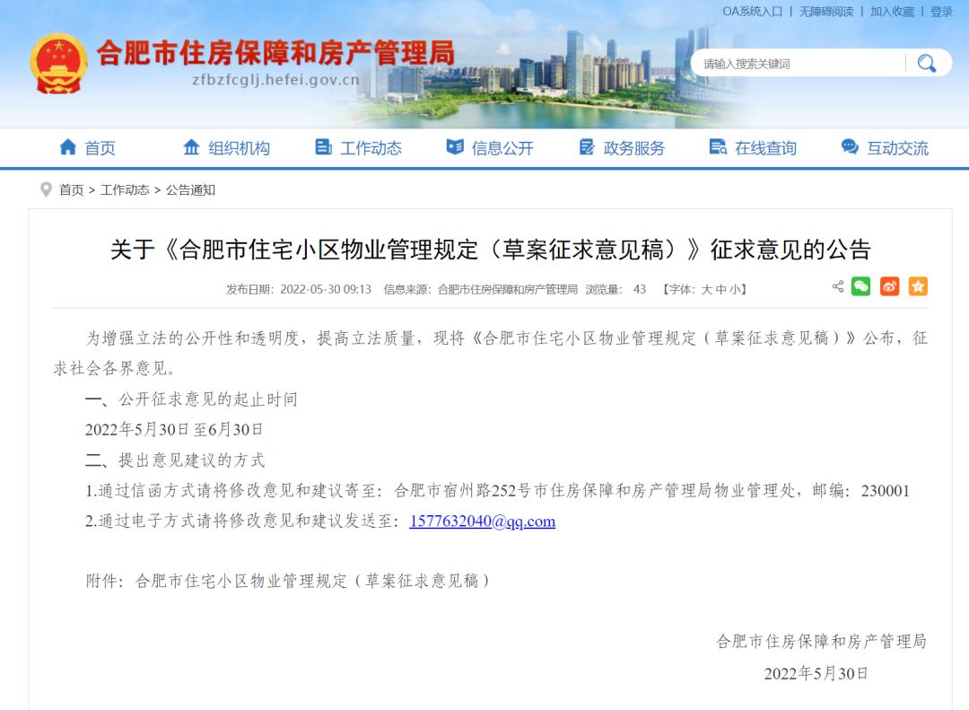 5月30日,合肥市住房保障和房产管理局发布“关于《合肥市住宅小区物业管理规定(草案征求意见稿)》征求意见的公告”,向社会公开征集意见。