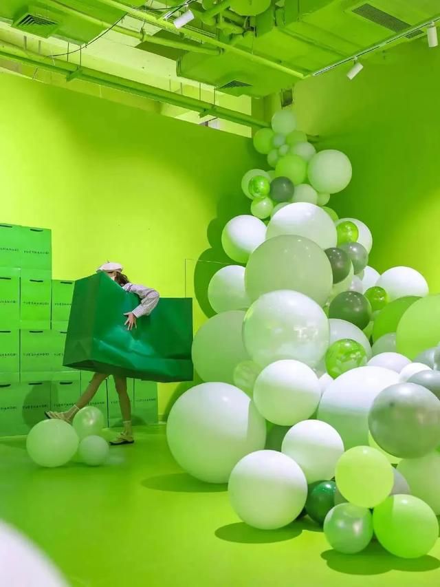 绿色潮流房间里超大的气球瀑布倾泻下来,视觉冲击力很强,蓝色游乐场房间则长满了神奇的海洋“毛毛怪”,给人以温暖和力量。