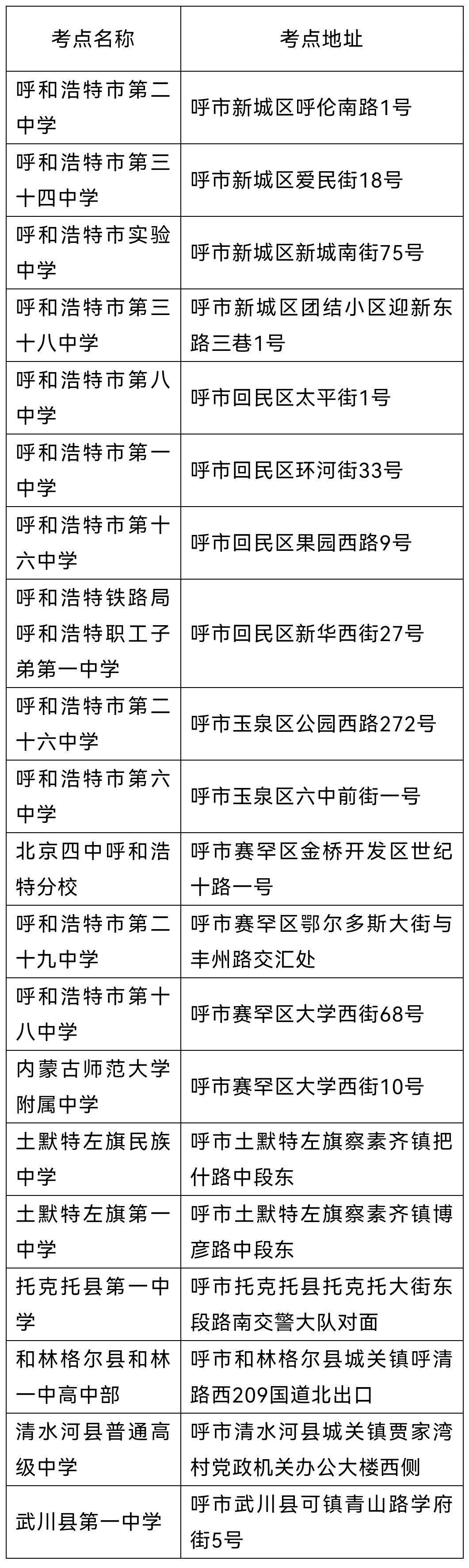 今年我市高考的考点设置有变化,具体为:新城区取消十九中考点,赛罕区取消赛罕民中考点,托县民中改为托县一中。