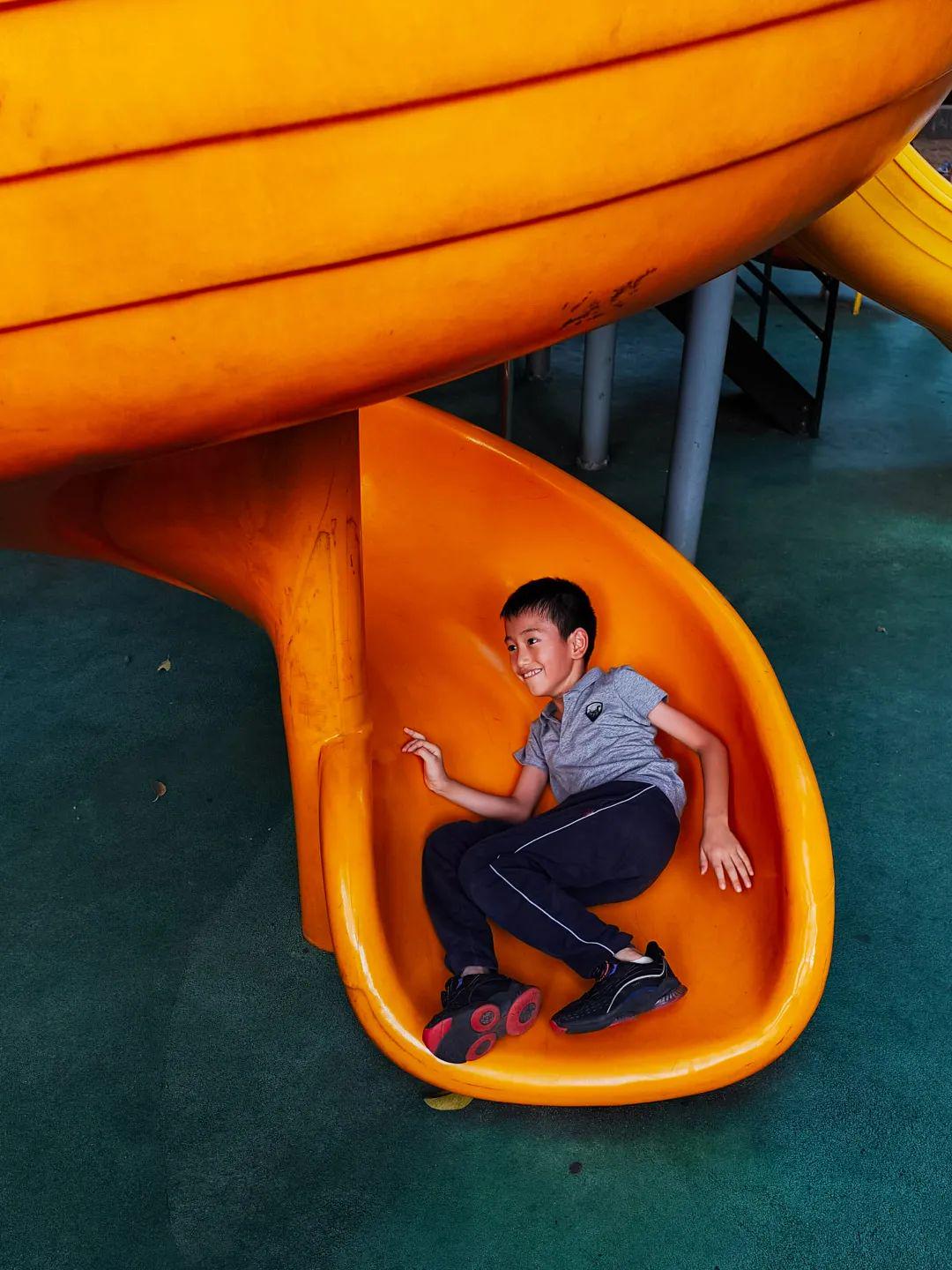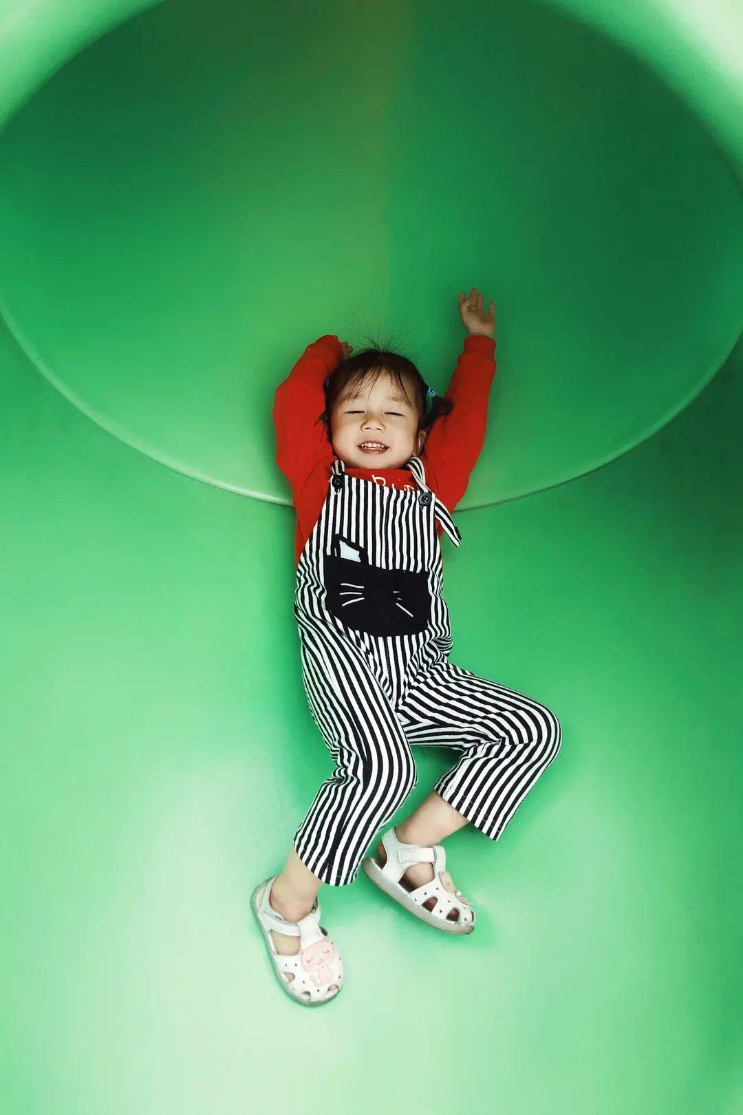 比如,各种拥有线条美感的滑梯,就是拍孩子的不错选择,具有一定的空间延伸感。拍摄时,可以定格孩子躺在滑梯末端玩耍的画面。