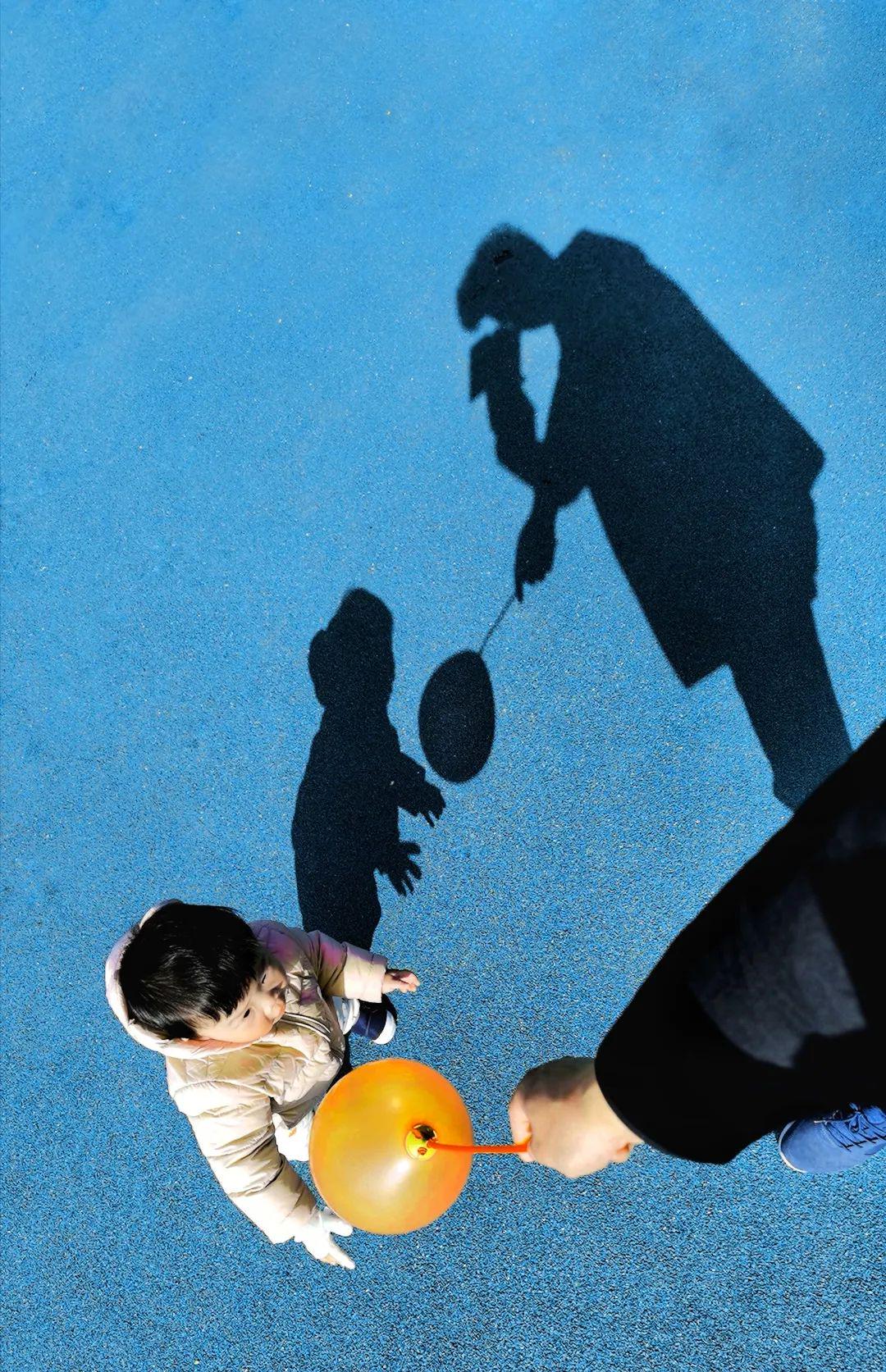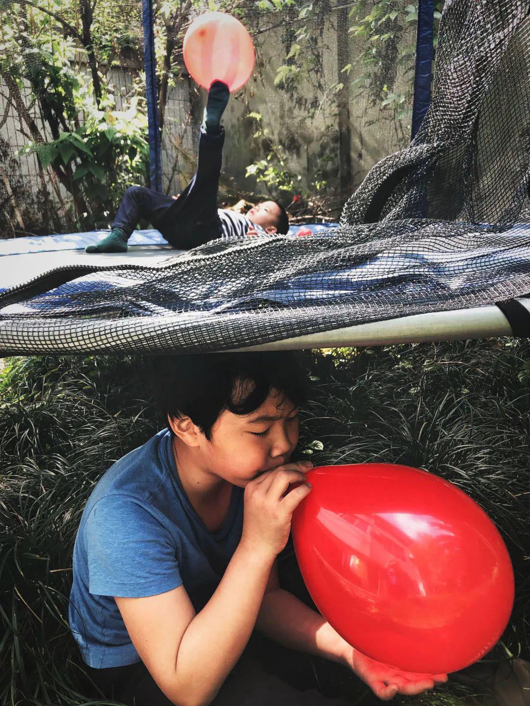 比如,下面的照片中,夹板上下,两个孩子在各自玩弄气球,“一踢一吹”,同一画面两个世界,画面十分趣味。