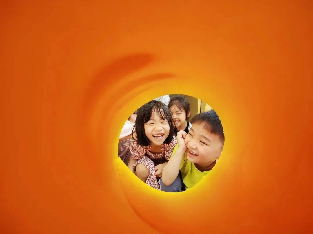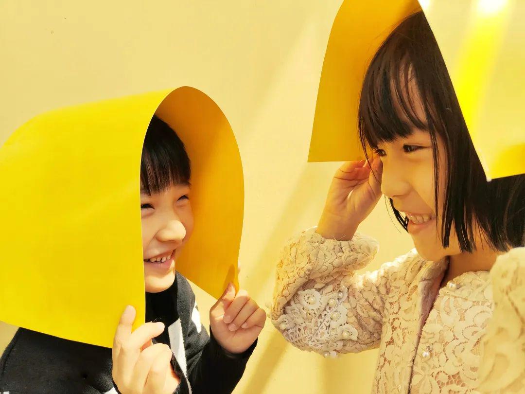 像将彩色卡纸卷起来作为画面前景,孩子们可以在卡纸后嬉戏玩闹。
