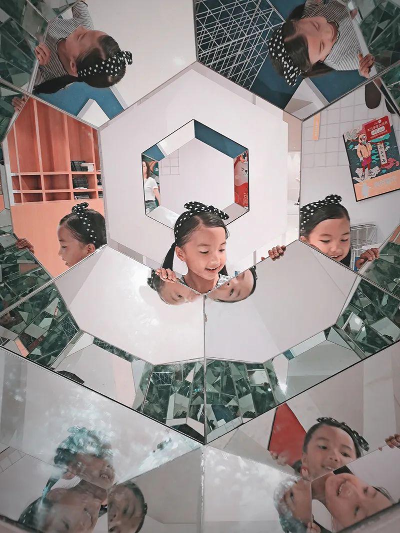 当你遇到一些存在镜子元素的生活场景时,可以利用镜面反射效果去拍孩子,进而打造虚拟的空间影像,形成有趣的视错觉,丰富画面内容。
