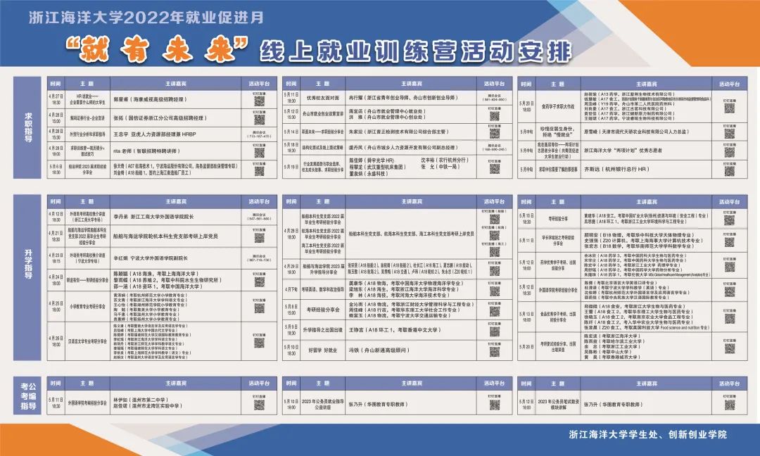 会同舟山市人社局、舟山市就业管理中心,开展“求职第一课”系列活动。举办2022年“就有未来”线上训练营,通过钉钉直播、腾讯会议、QQ群听课和华图教育平台等方式,开设就业指导讲座37场,内容涉及求职指导(春招形势解读、行业发展趋势与职业选择、线上面试指导、简历制作、就业政策、求职经验分享、校友成长故事等)、升学指导(考研经验分享、出国出境深造等)以及考公考编指导等三大板块。重点邀请人力资源领域资深女性HR、女企业家为女大学生讲述职场经历、传授职场经验、进行就业指导,分析当前就业形势、女生就业面临的挑战,以及如何为将来顺利就业做好准备,为女大学生树立巾帼榜样,增强求职就业自信心。