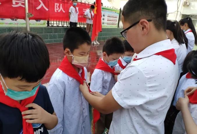 6月1日,达士营学校新队员入队仪式在雄壮嘹亮的《中国少年先锋队队歌》声中拉开了帷幕,少先队员们手捧红领巾,在《红领巾飘起来的》的音乐声中,为敬爱的老师们佩戴上鲜艳的红领巾。随后,优秀少先队员代表为每一位新队员亲手佩戴红领巾。这是星星火炬交接的时刻,更代表着红色基因代代相传!从此,鲜艳的红领巾飘荡在胸前,无上的光荣涌动在新队员们的心中。