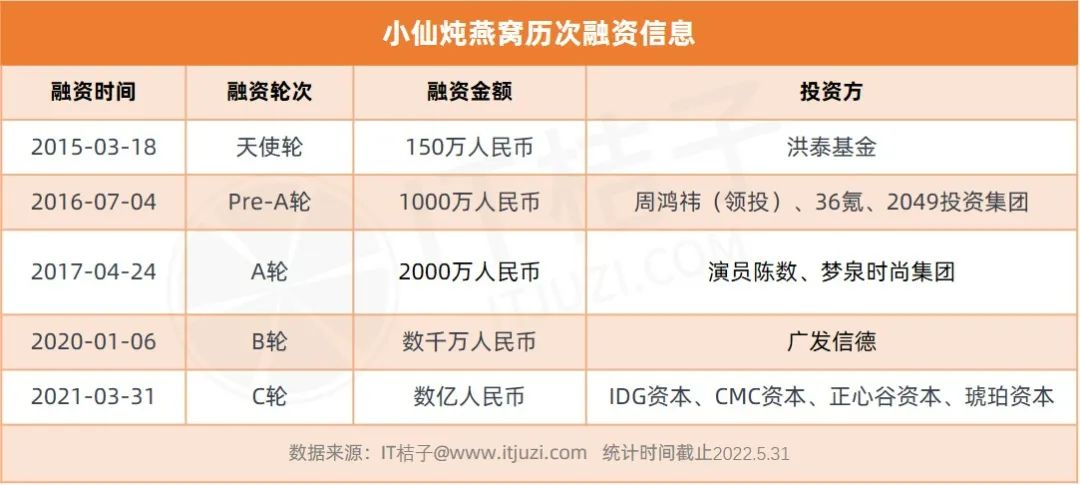 根据IT桔子数据,在2017年4月,陈数、梦泉时尚集团联合投资了小仙炖A轮2000万元。2021年,IDG资本、正心谷资本、CMC资本等也投资了小仙炖燕窝。