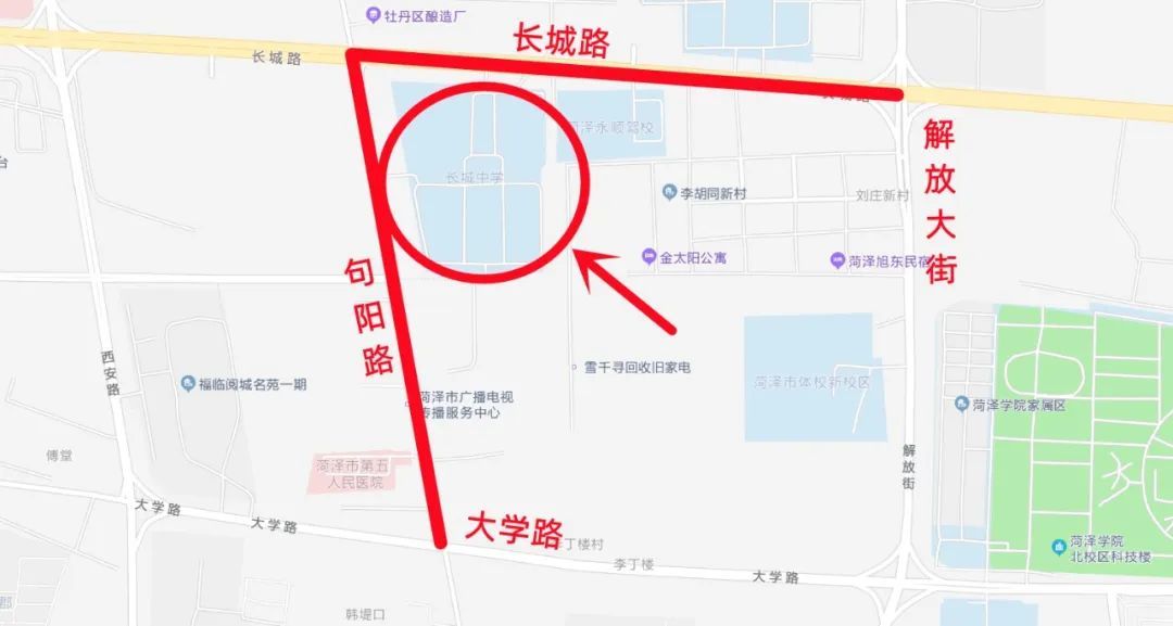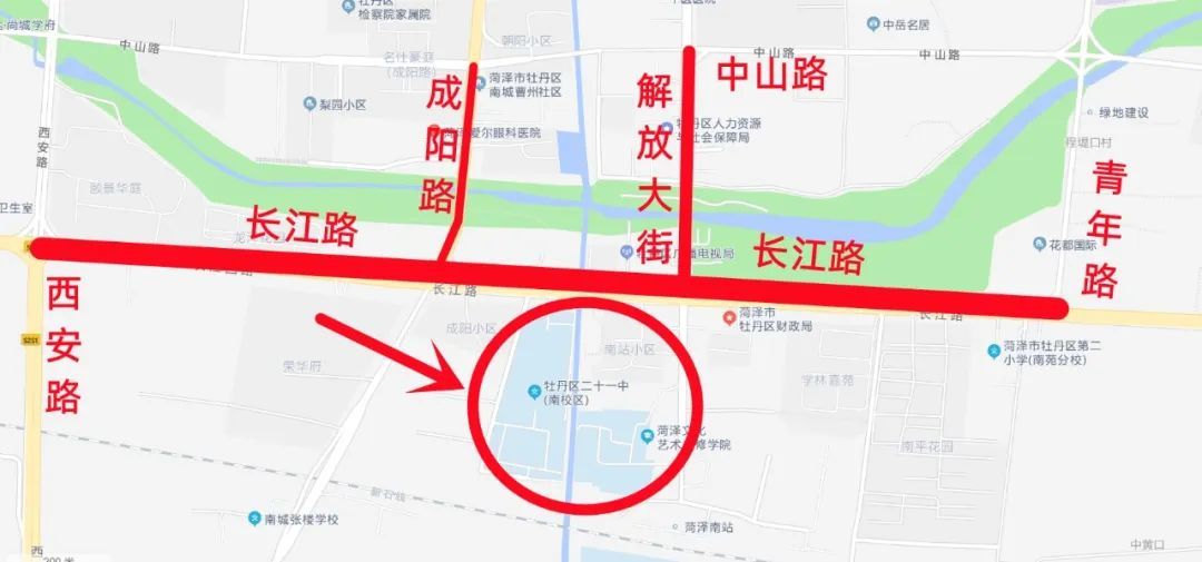 牡丹区二十一中教育集团长江路中学考点附近:市长江路的西安路路口至青年路路口、市解放大街的中山路路口至长江路路口、市成阳路的中山路路口至长江路路口为管制路段。