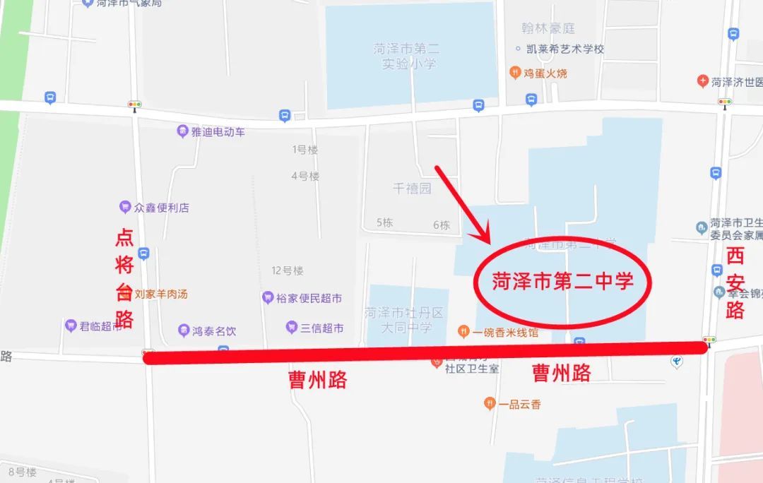 菏泽市第二中学考点附近:市曹州路的西安路路口至点将台路路口为管制路段。交警部门将在市曹州路点将台路口、曹州路西安路口分流、截流一切社会车辆,只允许送考生的车辆通行。
