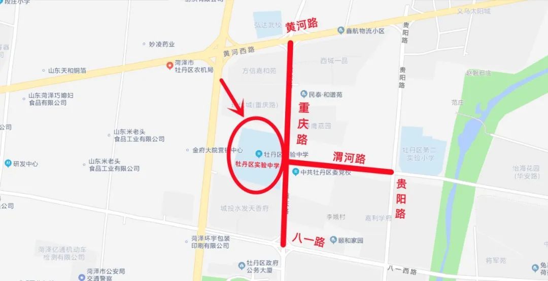牡丹区实验中学考点附近:市重庆路的黄河路路口至八一路路口、市渭河路的贵阳路路口至重庆路路口为管制路段。交警部门将在市重庆路黄河路口、重庆路八一路口、渭河路贵阳路口分流、截流一切社会车辆,只允许送考生的车辆通行。