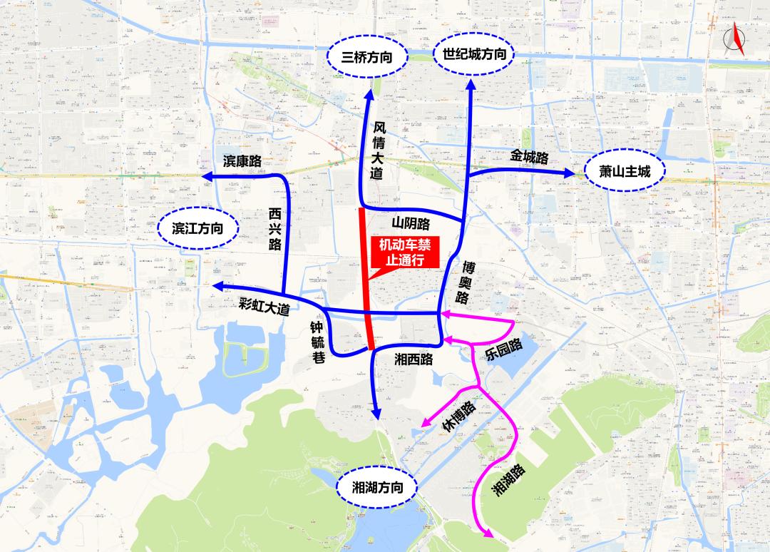 1、风情大道向滨江方向车辆可由湘西路-钟毓巷-彩虹大道绕行;风情大道向主城、萧山方向车辆可由湘西路-博奥路绕行。