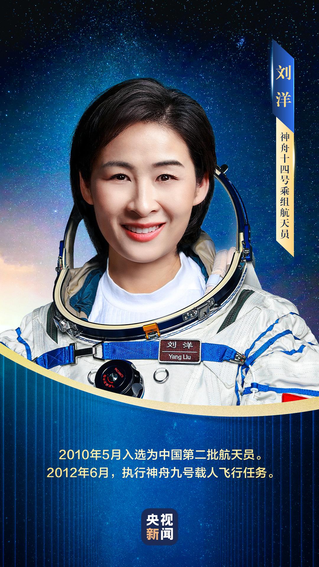 刘洋,女,汉族,籍贯河南林州,河南郑州出生,中共党员,博士学位。1978年10月出生,1997年8月入伍,2001年5月加入中国共产党,现为中国人民解放军航天员大队特级航天员,大校军衔。曾任空军某师某团某飞行大队副大队长,被评为空军二级飞行员。2010年5月入选为我国第二批航天员。2012年6月,执行神舟九号载人飞行任务,同年10月,被中共中央、国务院、中央军委授予“英雄航天员”荣誉称号,并获“三级航天功勋奖章”。经全面考评,入选神舟十四号载人飞行任务乘组。