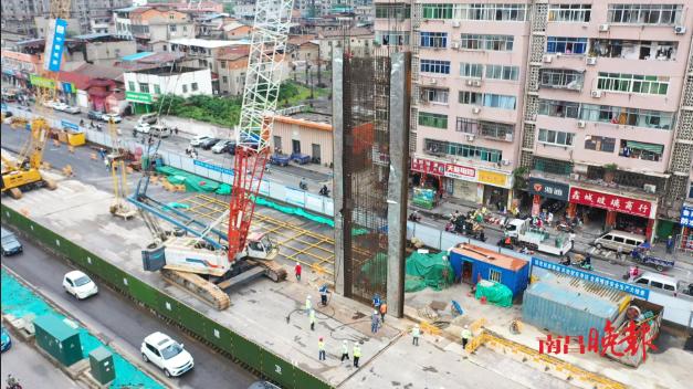 位于青山湖区解放西路与上海南路交叉路口以东,地下管线复杂,同时与居民区、商铺距离较近,沿街店铺与车站主体基坑最近距离仅8.8米,施工难度大。项目部不断优化交通疏解及管线迁改方案,同时,积极与城管局、交警队等政府有关部门协调,合理计划施工时间,尽力降低对周围住户及商铺的影响。