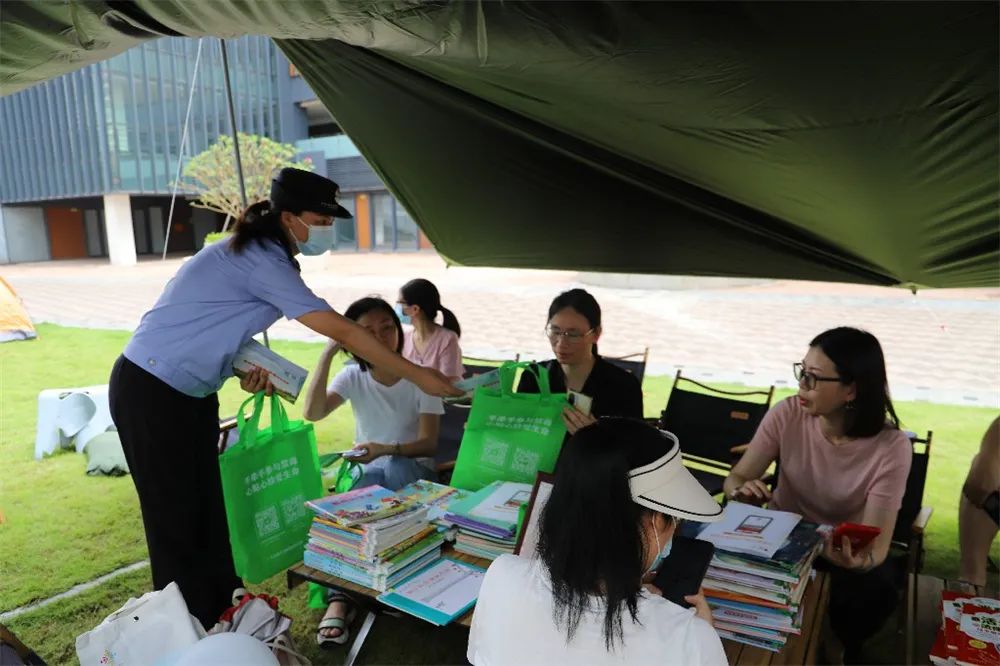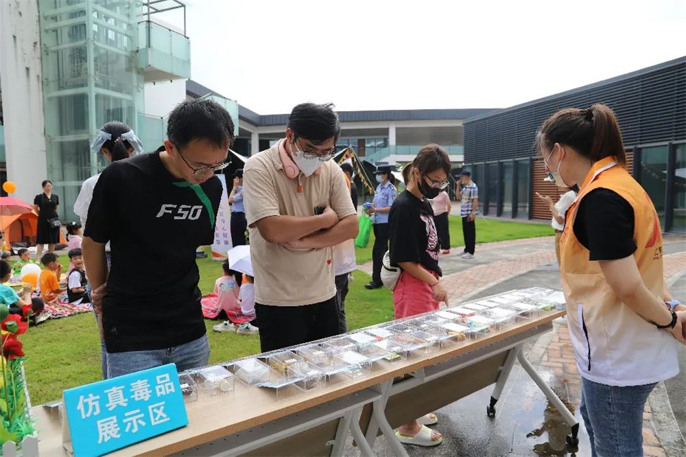 现场还设置了新型毒品模型展示区、亲子阅读区、禁毒游戏区。禁毒社工通过新型毒品模型向群众介绍新型毒品的种类及其危害,家长们还纷纷拿出手机拍照,并发到朋友圈、微信群,进行“二次普法”。现场孩子们专注地听王警官的讲解,在提问环节纷踊跃发言,答对的小朋友还现场获得小礼品一份,禁毒普法营地课堂氛围轻松愉快。