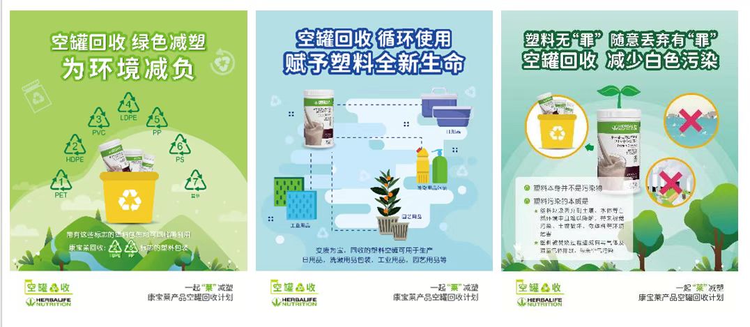 康宝莱产品空罐回收计划鼓励康宝莱顾客将产品空罐送到参与回收项目的营养俱乐部,再由全球资源优化管理领域的专业机构处理后进行再生造粒,成为等同于原生塑料质量的日用品、洗护用品包装和工业用品等的原料,实现消费后塑料的循环使用。康宝莱的奶昔和片剂罐、瓶均采用食品级塑料,相较于复合塑料不需要进行材料剥离,便可实现100%回收再利用。
