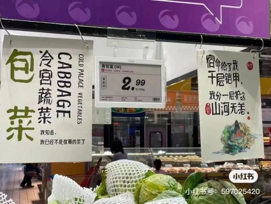 “我们把大家过去两个月经常吃到的蔬菜拟人化,把它们的‘心声’写出来,比如蔬菜‘保供五兄弟’。另一方面把可乐、薯片、小葱这些市民迫切需要的食物给列为‘顶流‘。”陈润鑫表示,用这样趣味的划分来方便市民购物,也可以让大家更快乐地逛超市。