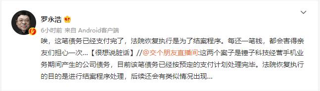 # 交个朋友回应 “ 罗永浩被恢复执行 2900 万 ”:该笔债务已处理完毕