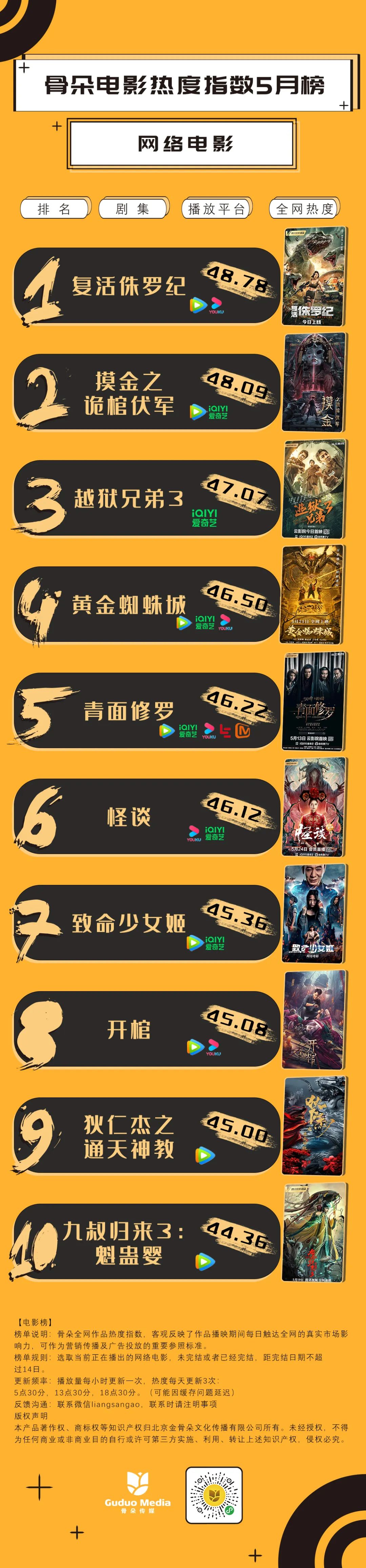 《越狱兄弟3》以47.07的热度排名第3;冒险电影《黄金蜘蛛城》46.50排名第4;动作悬疑电影《青面修罗》热度指数46.22位居第5;惊悚电影《怪谈》46.12位居第6。前六名热度旗鼓相当。《致命少女姬》、《开馆》、《狄仁杰之通天神教》热度不相上下,均在45以上;《九叔归来3:魁蛊婴》以44.36位居第10。较上月相比,网络电影热度整体有所上升。