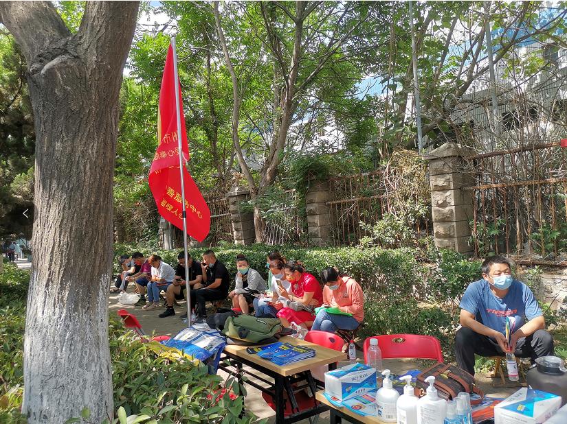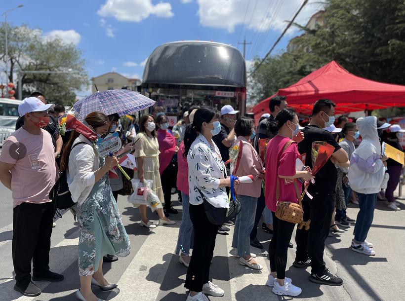 青岛58中门口等候的家长。半岛全媒体记者 孙雅琴 摄