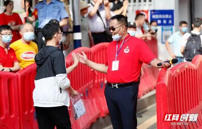 7日,长沙市一中考点,一位老师守在校门口,与每位学生击掌送祝福。(图/红网)