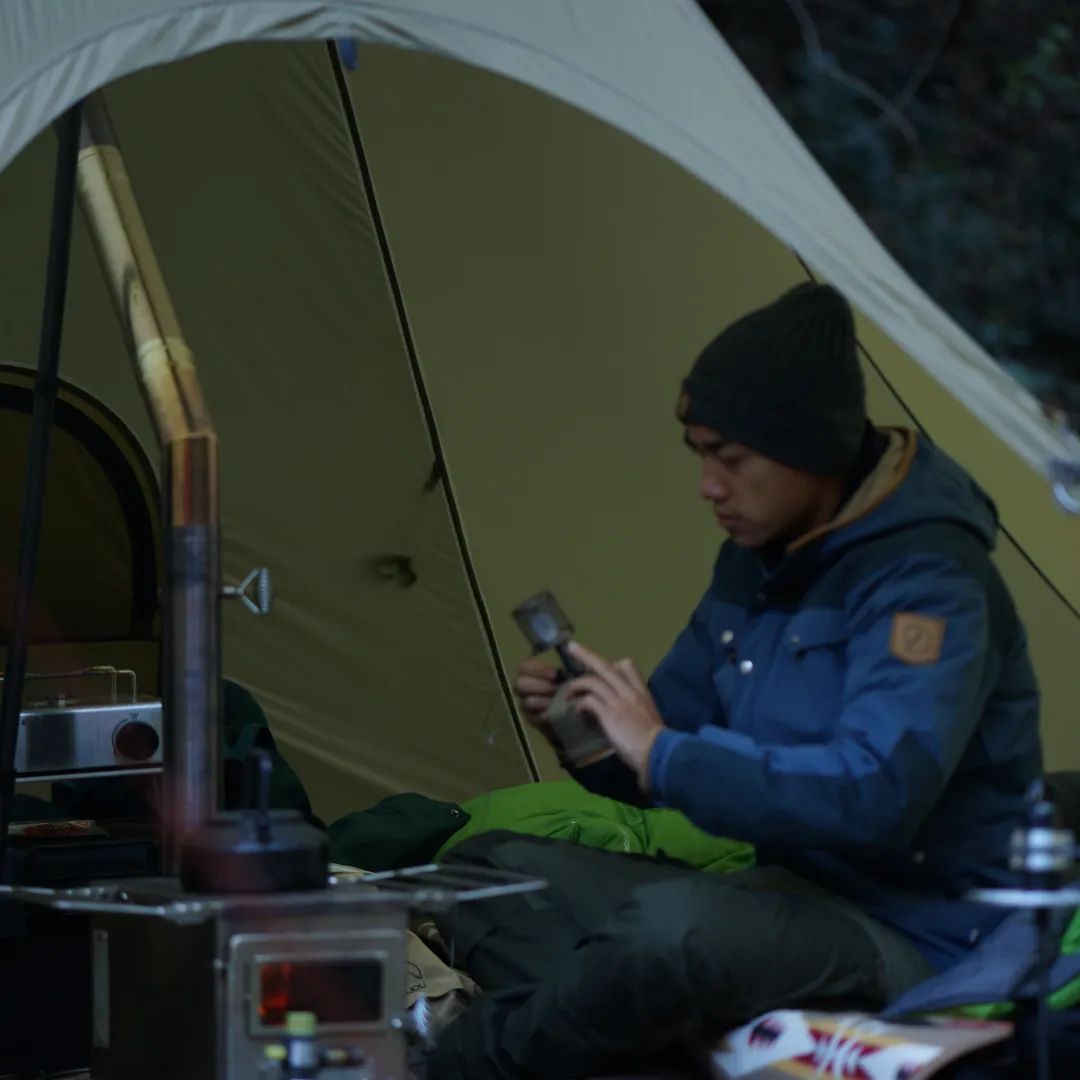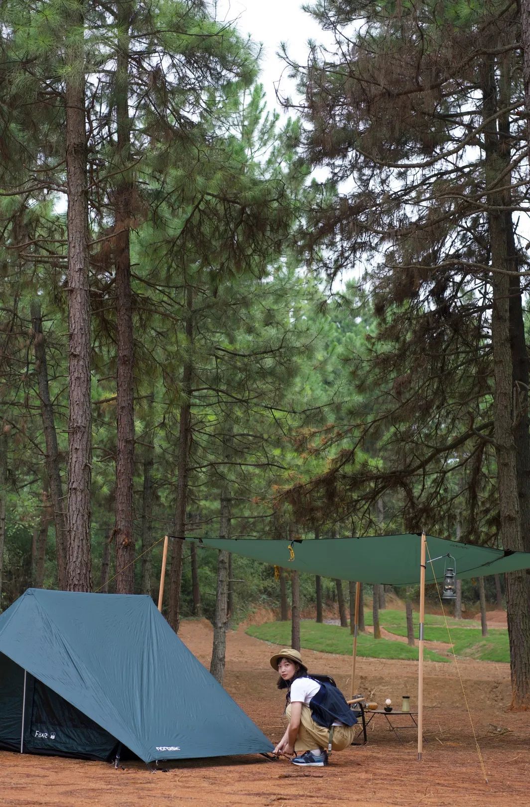 在这里,朋友们生起篝火、促膝长谈,在自然的空间里小酌一杯,恬静惬意。第二天醒来之后,阳光洒在帐篷上,与落下的松针组成影影绰绰的图案,这些都构成了我心中关于营地的美好模样。