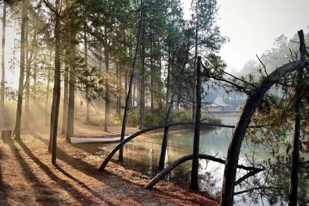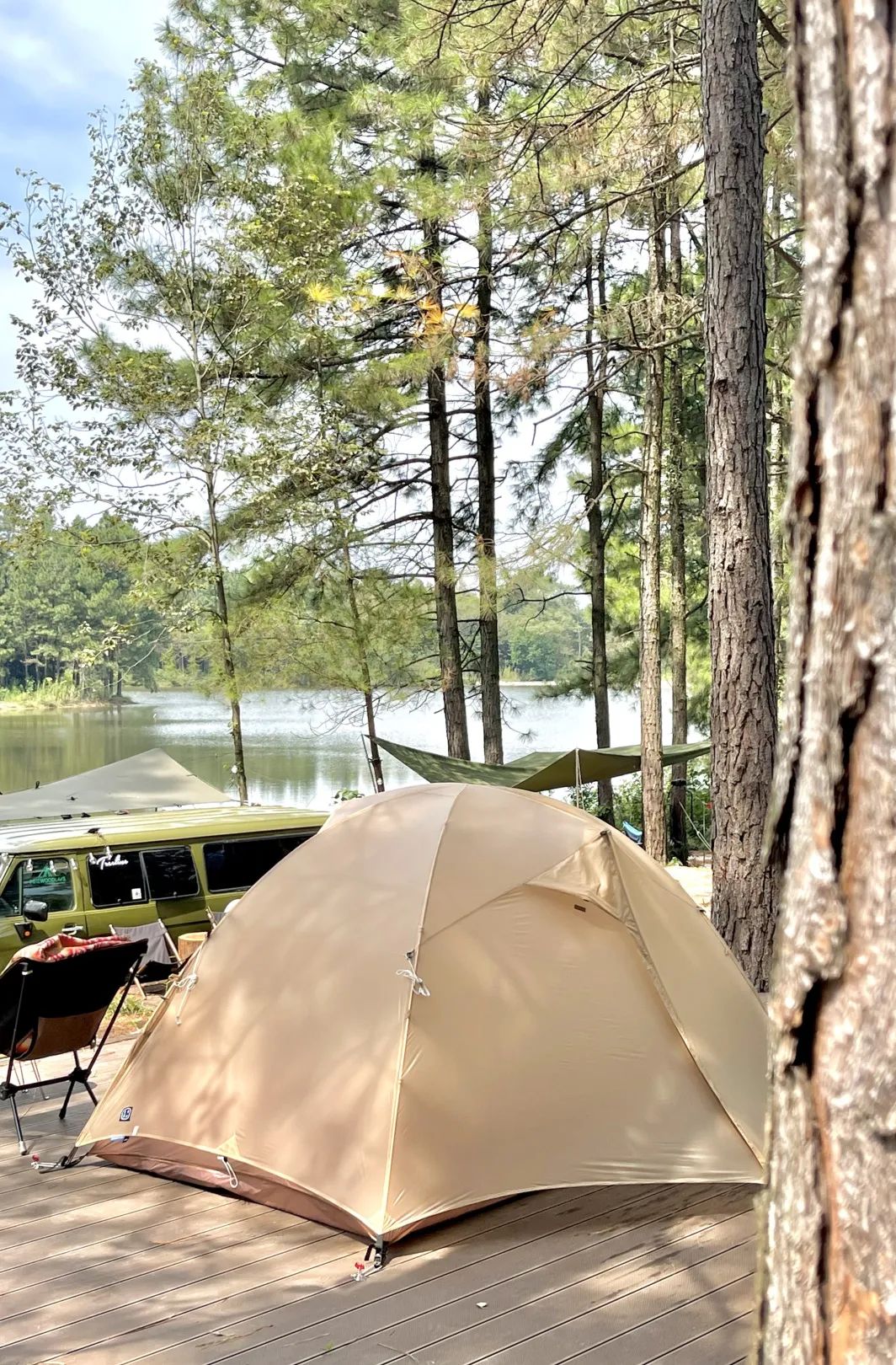 我常去的露营地是位于浙江安吉的treeline树线户外营地,也就是营友们口中的松林湖营地。区别于普通小型露营场地,松林湖营地给人一种非常立体的感受,整个营地坐落于成片的松林之中,上千棵十多米高的松树把这里变成了一个世外桃源式的独立空间。在营地的核心位置,一个湖泊恰到好处地点缀其中。