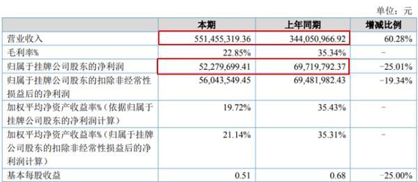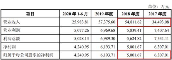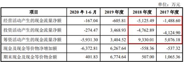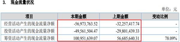 而同时作为曾在股转系统挂牌企业,股转系统发行人2017年和2018年报则显示,同期营收分别为34405.10万元、55145.53万元,归母净利润分别为6971.98万元、5227.97万元。同时经营活动现金流量净额分别为-3227.74万元、-5697.38万元,投资活动现金流量净额分别为-2980.14万元、-4956.15万元,筹资活动现金流量净额分别为5668.56万元、10095.16万元。