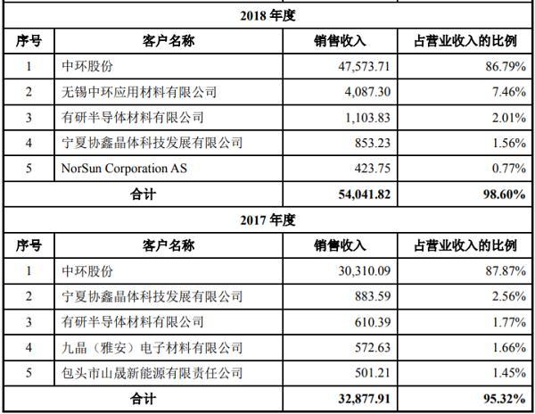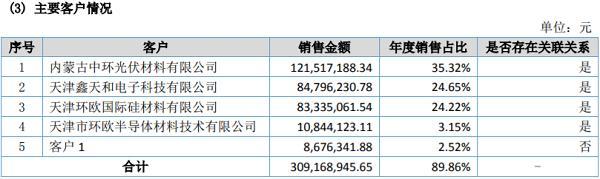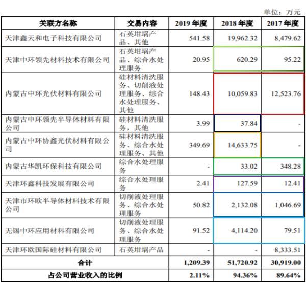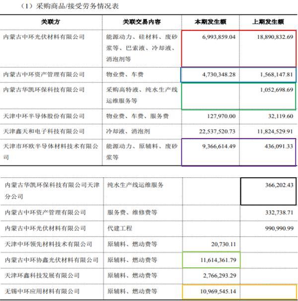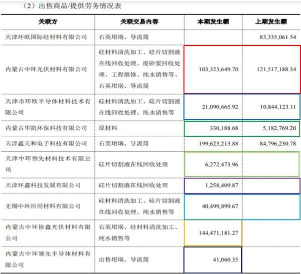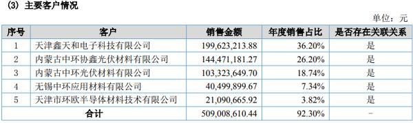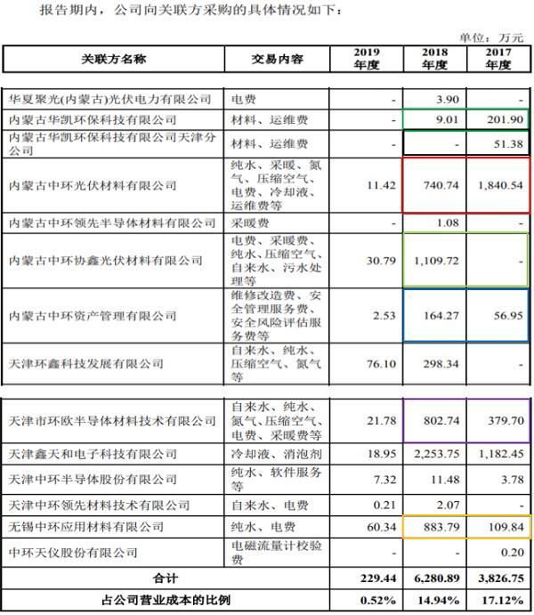 关联采购信息也存在类似的情形。除采购额数据的不同外,股转系统2018年度并未将与华夏聚光(内蒙古)光伏电力有限公司、内蒙古中环领先半导体材料有限公司、中环天仪股份有限公司的交易列入关联交易,2017年未将与无锡中环应用材料有限公司的交易列入关联交易。此外,招股书则未将2018年度与内蒙古华凯环保科技有限公司的交易列入关联交易。