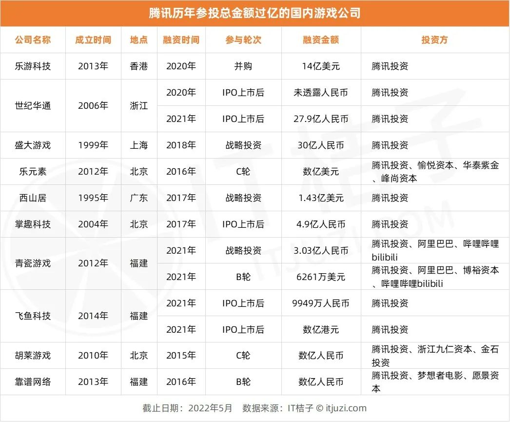据 IT 桔子统计,腾讯参与的上百起国内游戏行业投资事件中,有超 10 起单笔融资金额都已过亿——比如 14 亿美元并购乐游科技、30 亿元战投盛大游戏、1.43 亿美元战投西山居、4.9 亿元入股掌趣科技等。另外,2021 年腾讯两次参投的游戏公司有青瓷游戏和飞鱼科技。在 2015-2016 年,腾讯还参投胡莱游戏和靠谱网络的数亿元融资。